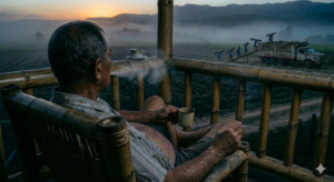 Meanwhile, across the expanse of the freshly cut field, the real employer sits unbothered—coffee in hand, distant from the call, distant from the file, distant from the chain of liability that never quite reaches him.